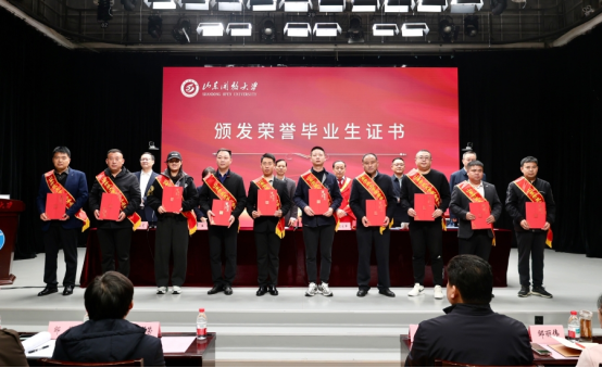 典礼上,校领导为曲峰、牛雪格、孙子栋等直属学院4名荣誉毕业生代表颁发证书,司家军为获得学士学位的直属学院崔玉洁、阮天慈等7人执拨穗礼,并颁发学位证书。