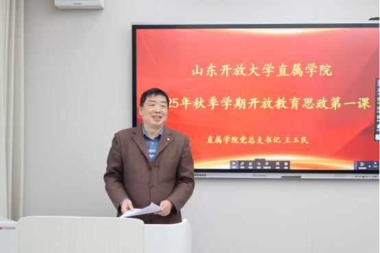 直属学院党总支书记王玉民首先欢迎新同学加入山东开放大学直属学院这个大家庭,他以“在抗战胜利80周年的历史坐标上书写终身学习的人生新篇章”为题,为全体新生讲授思政第一课。从以史为鉴,把“抗战精神”转化为“终身学习”的强大动力、知行合一,让“自主学习”夯实“学以致用”的发展底座、群策群力,以“团结协作”点亮“互助共赢”的发展之路、胸怀家国,将“终身学习”熔铸“报国担当”的精神底色四个方面谈了心得和体会,希望同学们在终身学习的旅程中追求理想,厚德为先、锤炼本领,能力为重、担当使命,践行为要,呼吁大家以抗战精神为帆,以实际行动书写终身学习与报国担当的壮丽篇章。