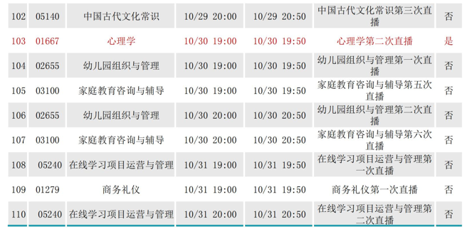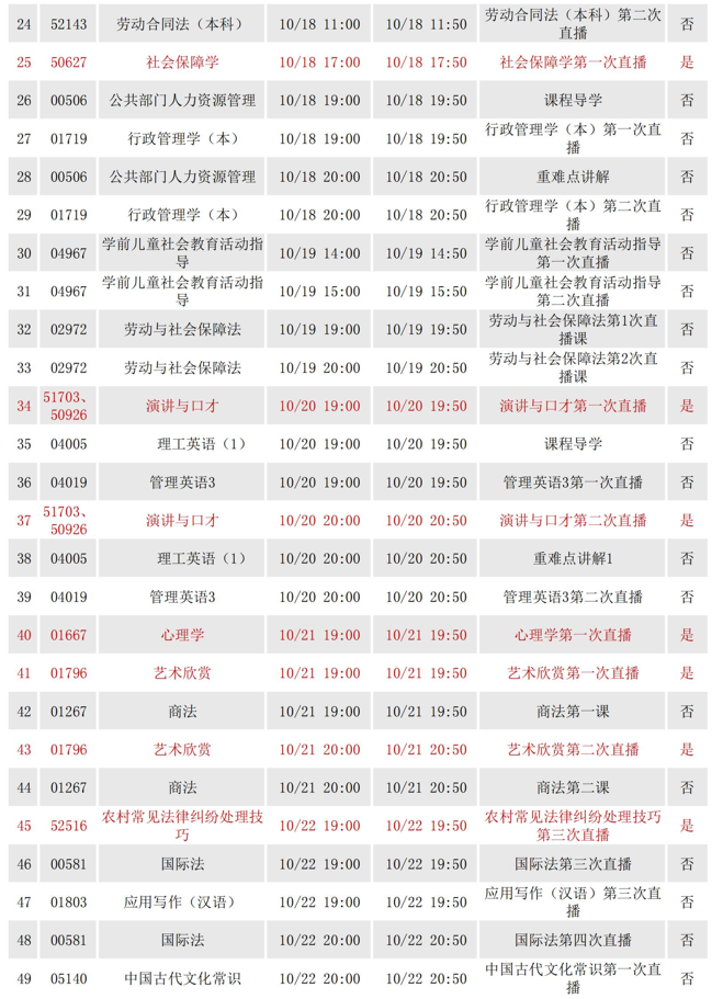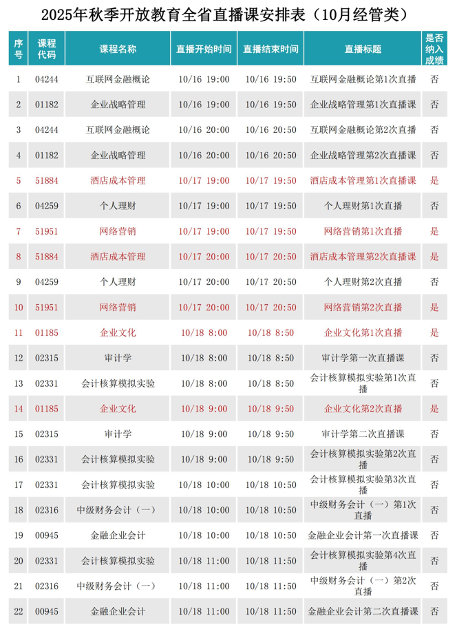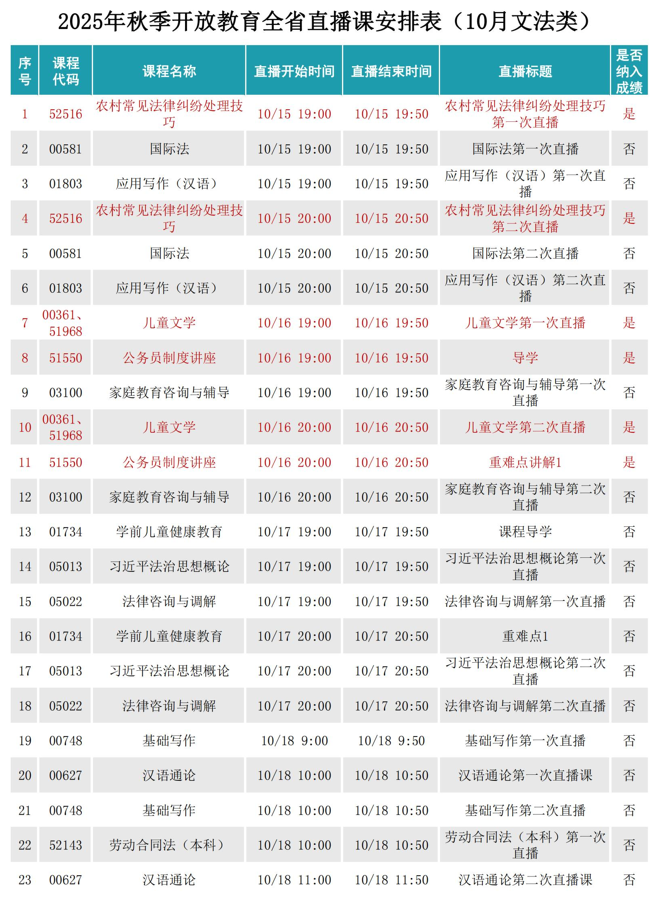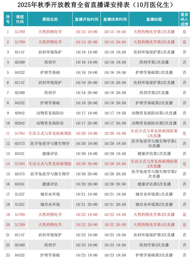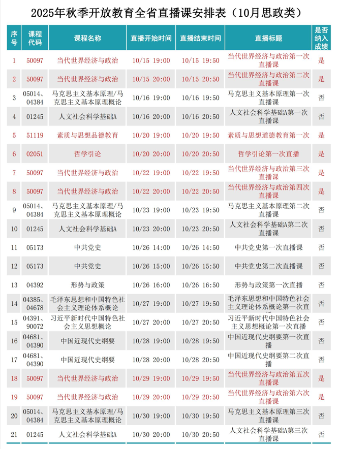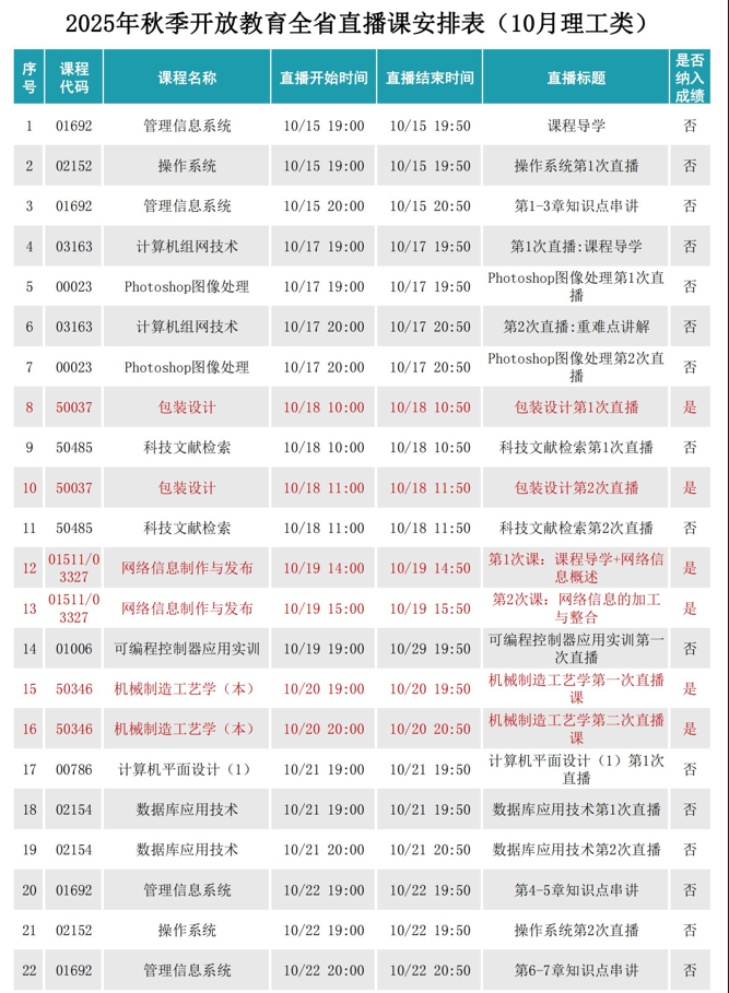 | 2025年秋季学期开放教育全省直播课安排表(10月) |